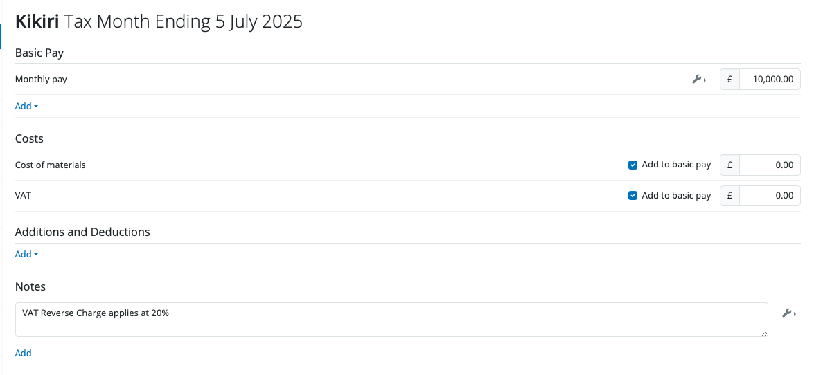 To aid completion of the necessary entries subsequently required in your accounting software and in turn the associated VAT return, you may wish to utilise the notes section on the subcontractor's payment screen to indicate when the reverse charge applies, as per the following example: