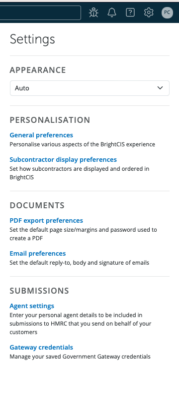 Please note: if you use specific HMRC credentials to send CIS submissions to HMRC, you can enter them in your Bright ID profile under > Settings > Gateway Credentials.