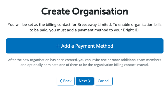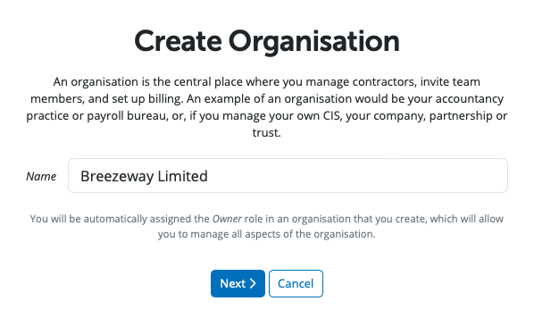 By default, the owner is set as the Billing Manager when they create the Organisation. This can be changed later if necessary.