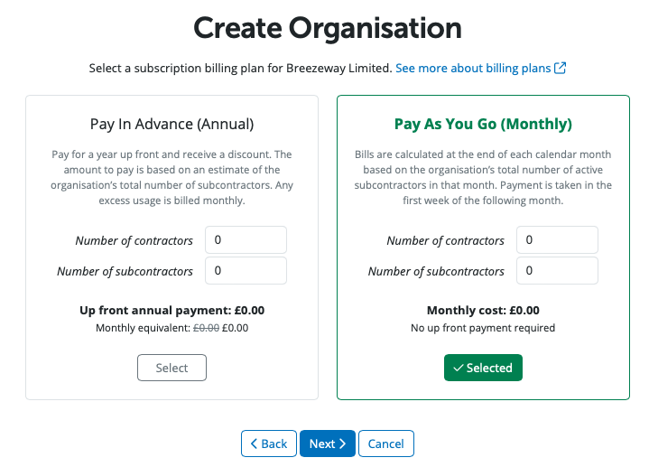 Please enter the number of contractors and number of subcontractors in the Annual option- you pay for a year up front based on an estimate of the organisation's total number of subcontractors and any excess usage is billed monthly, or in the Monthly option - the number of subcontractors in the organisation in the month will be billed for, in order to set up your billing plan.
