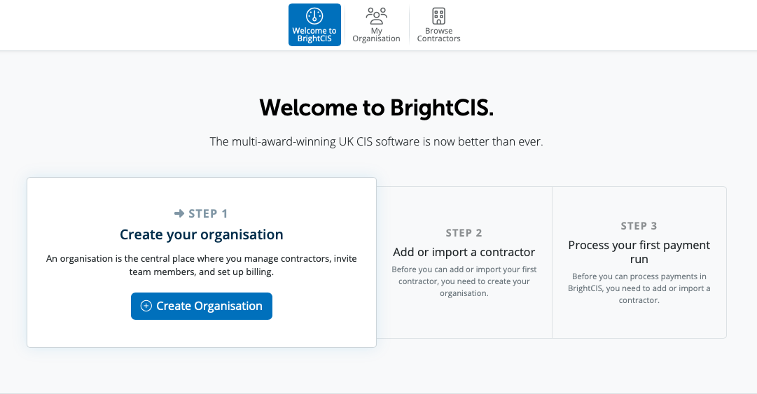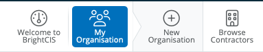 Once signed into BrightCIS, you will need to set up an Organisation. You can set this up under Welcome to BrightCIS as Step 1 or under My Organisations.