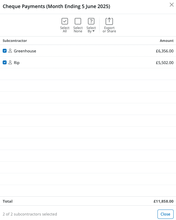 All Subcontractors whose payment method is set to 'Cheque' will be displayed on the screen and the report will show the breakdown of the Cheque payments to these Subcontractors.