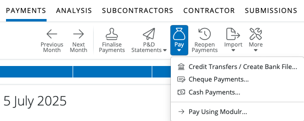 1) After finalising your Subcontractor payments in Payments, simply select 'Pay > Cheque Payments' on the menu toolbar.