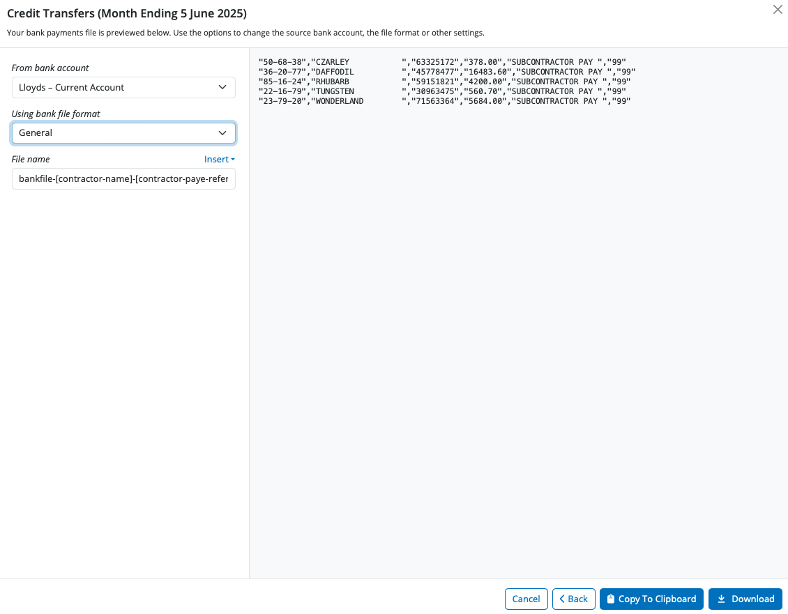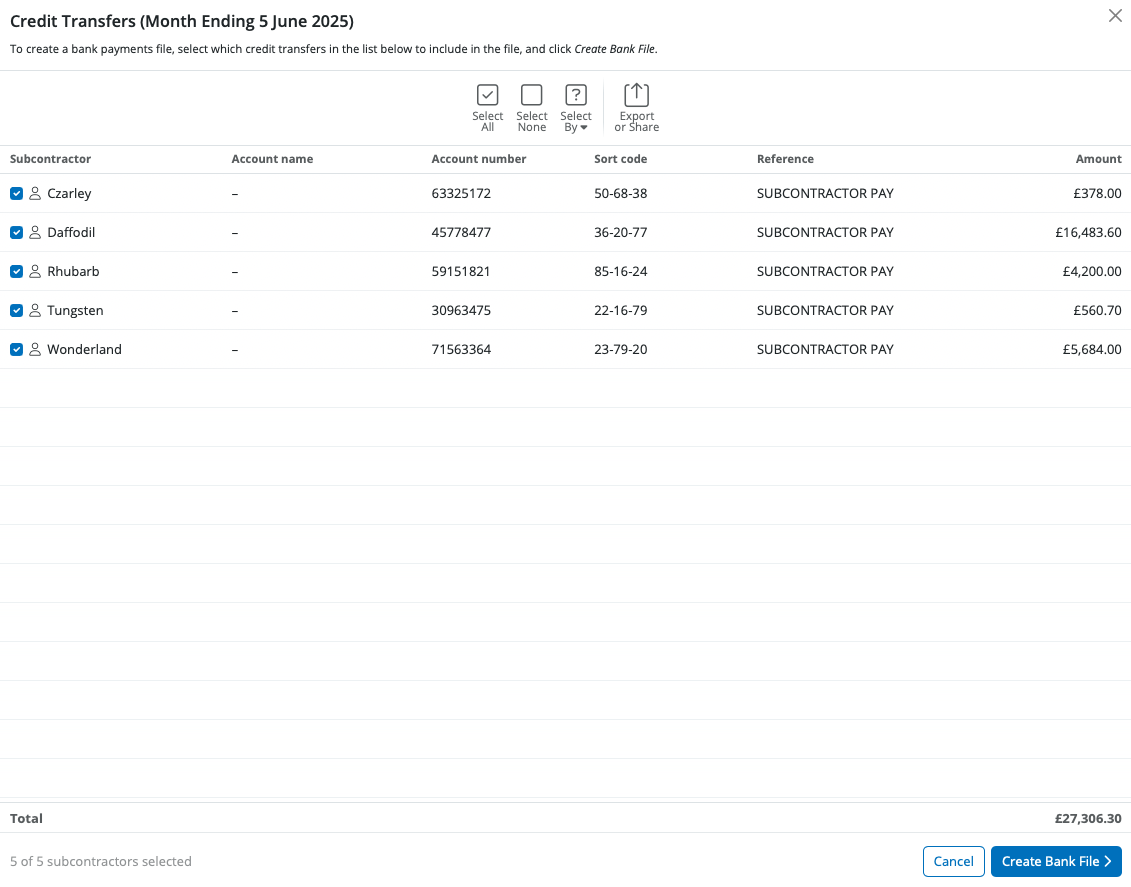 For subcontractors paid by credit transfer, a Bank Payment File can be created to upload through your banking software: