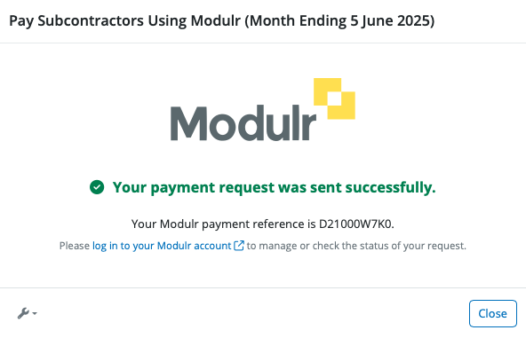 8) On approval, confirmation that your payment request has been successfully sent to Modulr will now be displayed: