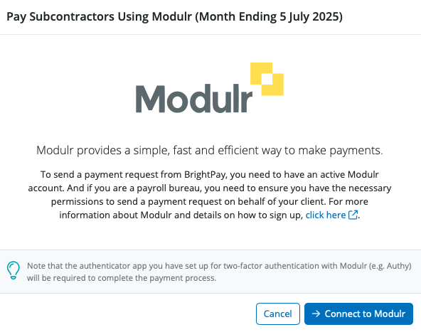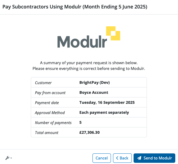 BrightCIS’ integration with Modulr provides a fast, secure and easy way to pay subcontractors through BrightCIS, eliminating the need to create bank files and the manual workload associated with making payments to subcontractors.