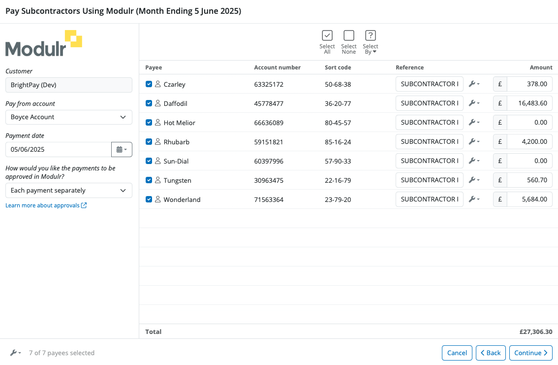 Please note: in the event you wish to amend a subcontractor's payment amount to be paid through the Modulr utility (e.g. where a subcontractor has been given an advance payment), simply amend the amount accordingly. It is important to note that this will not change any payslip amounts, simply the amount being submitted to Modulr.