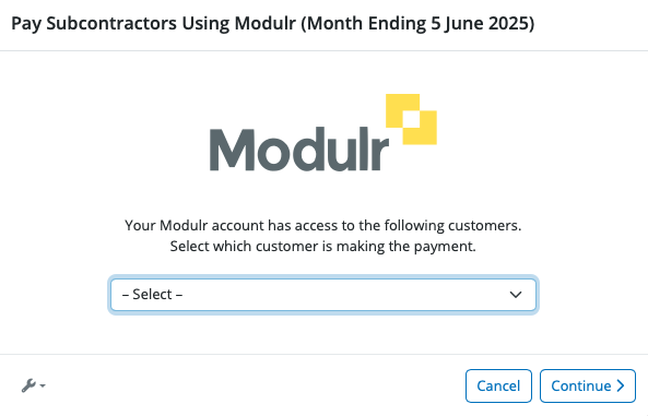 1) After finalising your subcontractor payments in the normal manner, simply click 'Pay > Pay using Modulr' to access the Modulr utility: