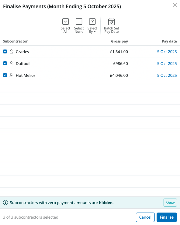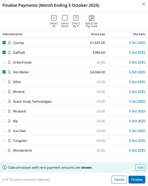 If you do not wish to see subcontractors with zero pay displayed on the Finalise Payments window simply select Hide.