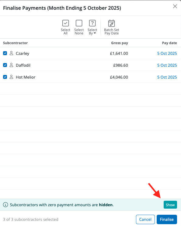 If you wish to update all subcontractors including the subcontractors with zero payment at the same time, simply click on ‘Show’. This will show all subcontractors with zero payments for the period on the Finalise Payments window. You can select if you wish to finalise these or not. Alternatively, if you only wish to finalise payments for some of the subcontractors, untick any subcontractors who you do not wish to include in the update and click ‘Finalise’. These subcontractors can be updated at a later time.