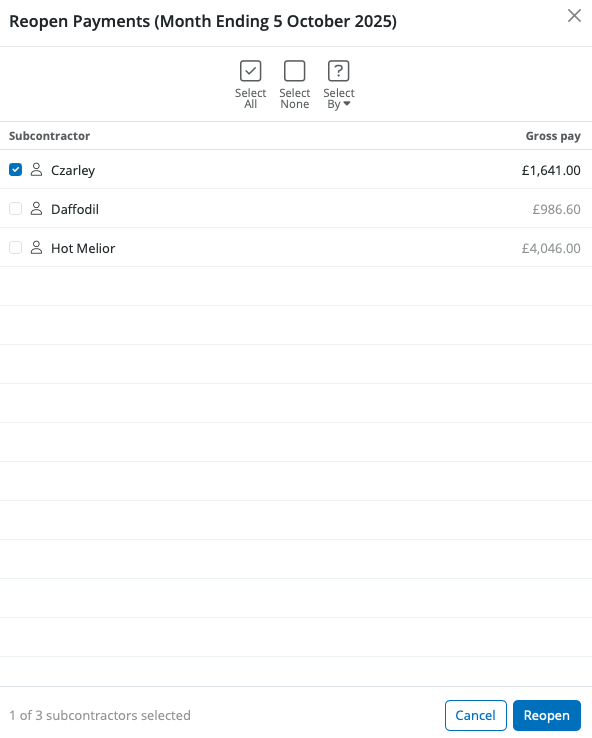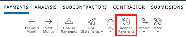 The selected subcontractor(s) payments will now be re-opened for the payment period selected and will be available for editing and finalising again.