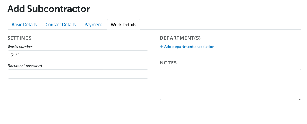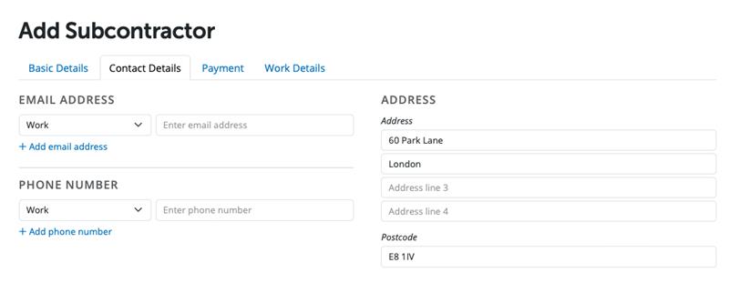 Complete the 'Contact Details' and 'Work Details' for a subcontractor as follows: