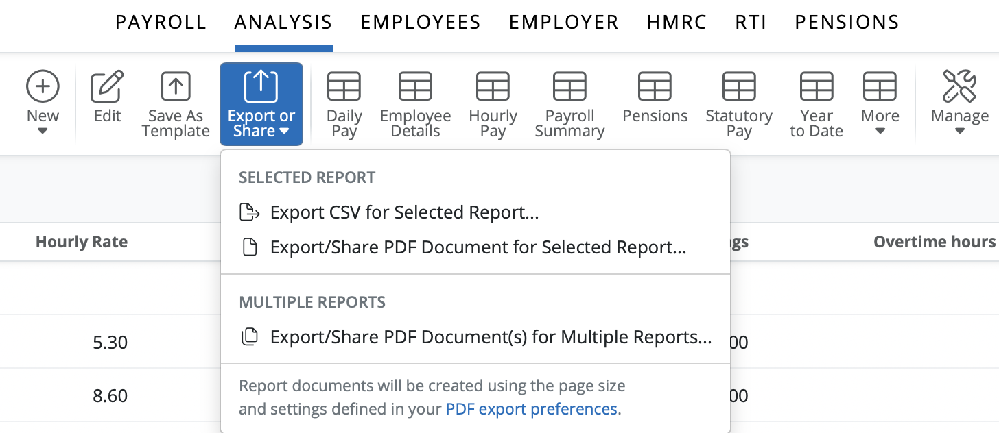 4) Should you need to change the orientation, paper size or print margins for the report, these can be amended by clicking 'the cog symbol' on the menu toolbar in the top right and selecting ' PDF export preferences'.