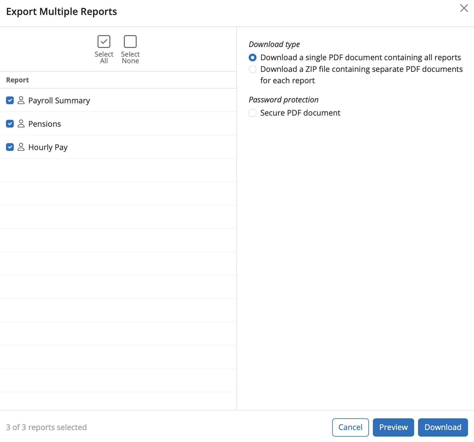 a) When downloading the multiple reports to a PDF document you can password protect the document if required. Tick 'Secure PDF Document' and select the password option required.