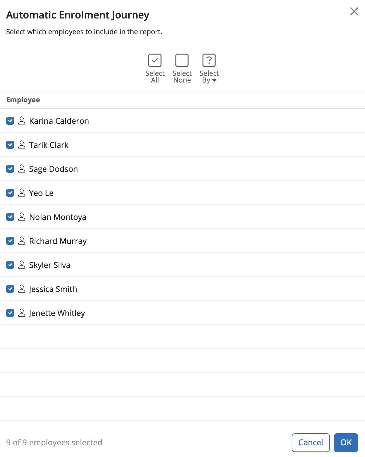 • Simply select the employee(s) whose automatic enrolment journey you wish to view and click 'OK' to generate the report: