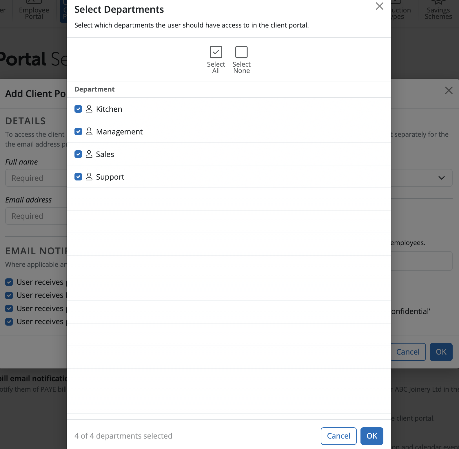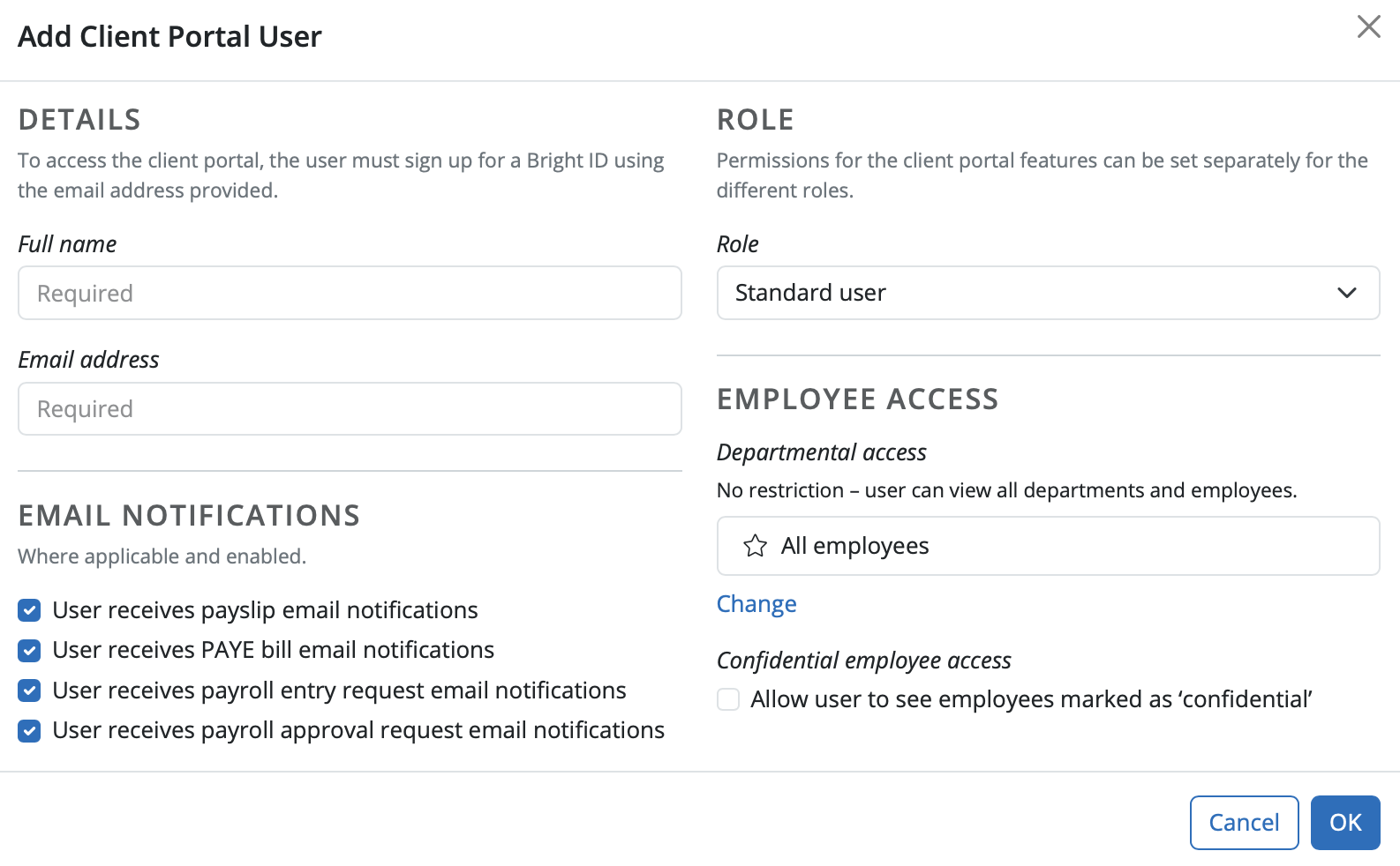 6) Click 'Ok'. The User has been set up with access to the Client Portal for the employer.