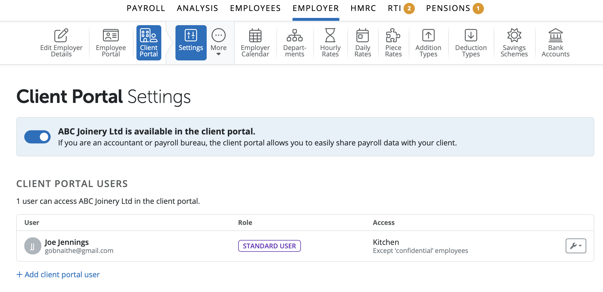 1) In BrightPay, open the employer you wish to add a User to the Client Portal for and go to > Employer > Client Portal > Settings.
