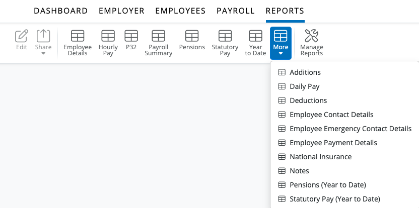 These saved reports represent the most common payroll reports generally used. The default reports that appear in the toolbar consist of: