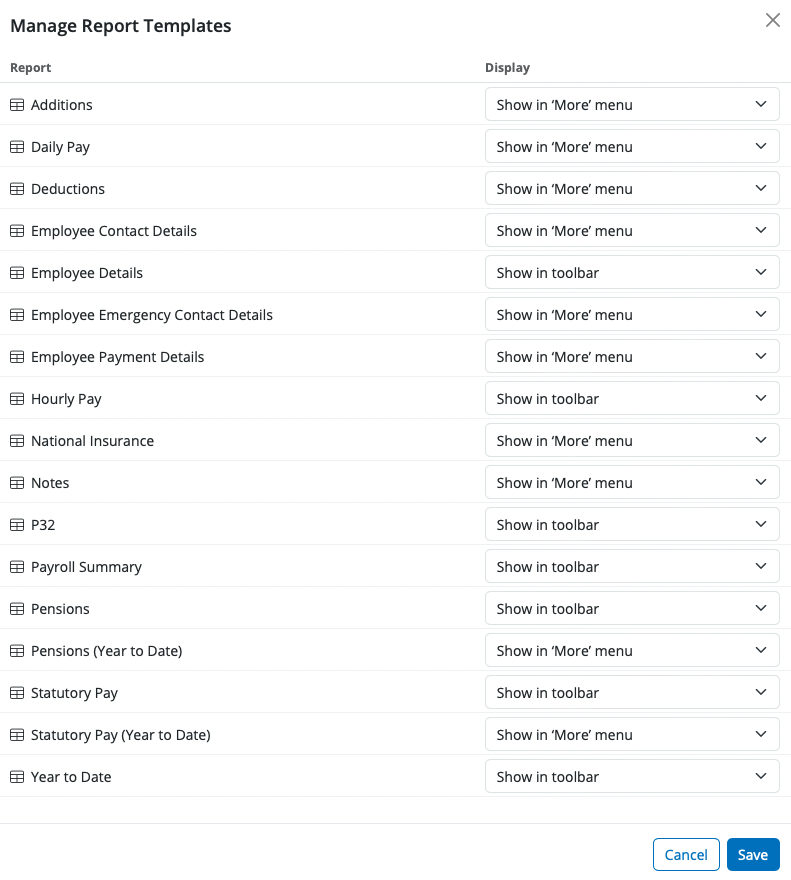 This utility allows you to manage saved reports. Here you can indicate whether a report is to show in the menu toolbar or within the 'More' menu.