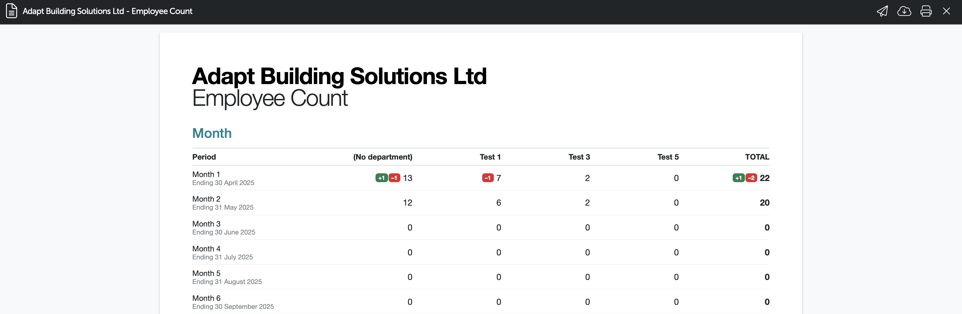 This report documents the number of employees in each pay period, including a departmental breakdown of employee numbers. It also indicates how many starters and leavers there are in each pay period, if applicable.