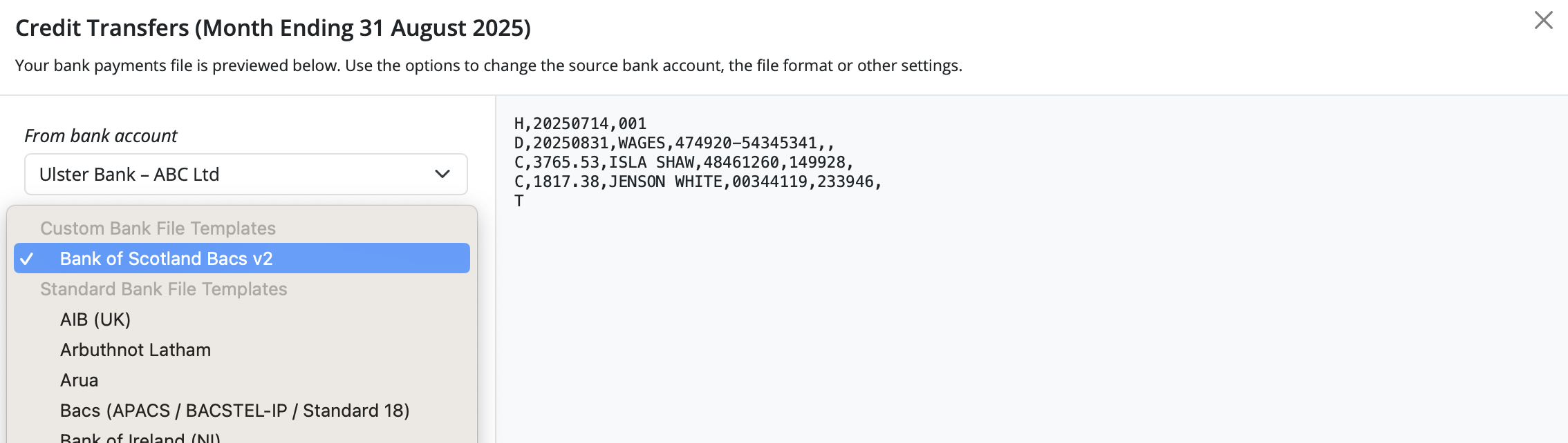 The bank payment file option will be available to select from the bank account list under the heading of 'Custom Bank File Templates'.