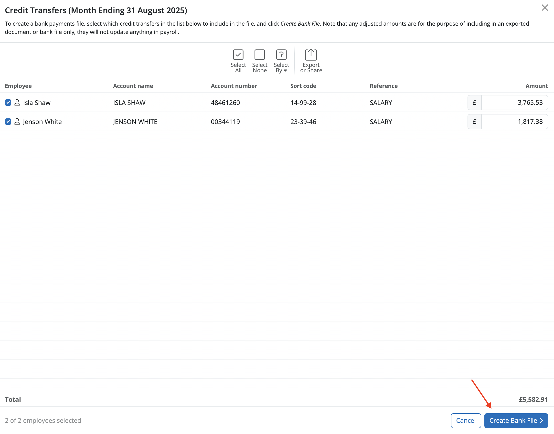 For employees paid by credit transfer, a Bank Payment File can be created to upload through your banking software: