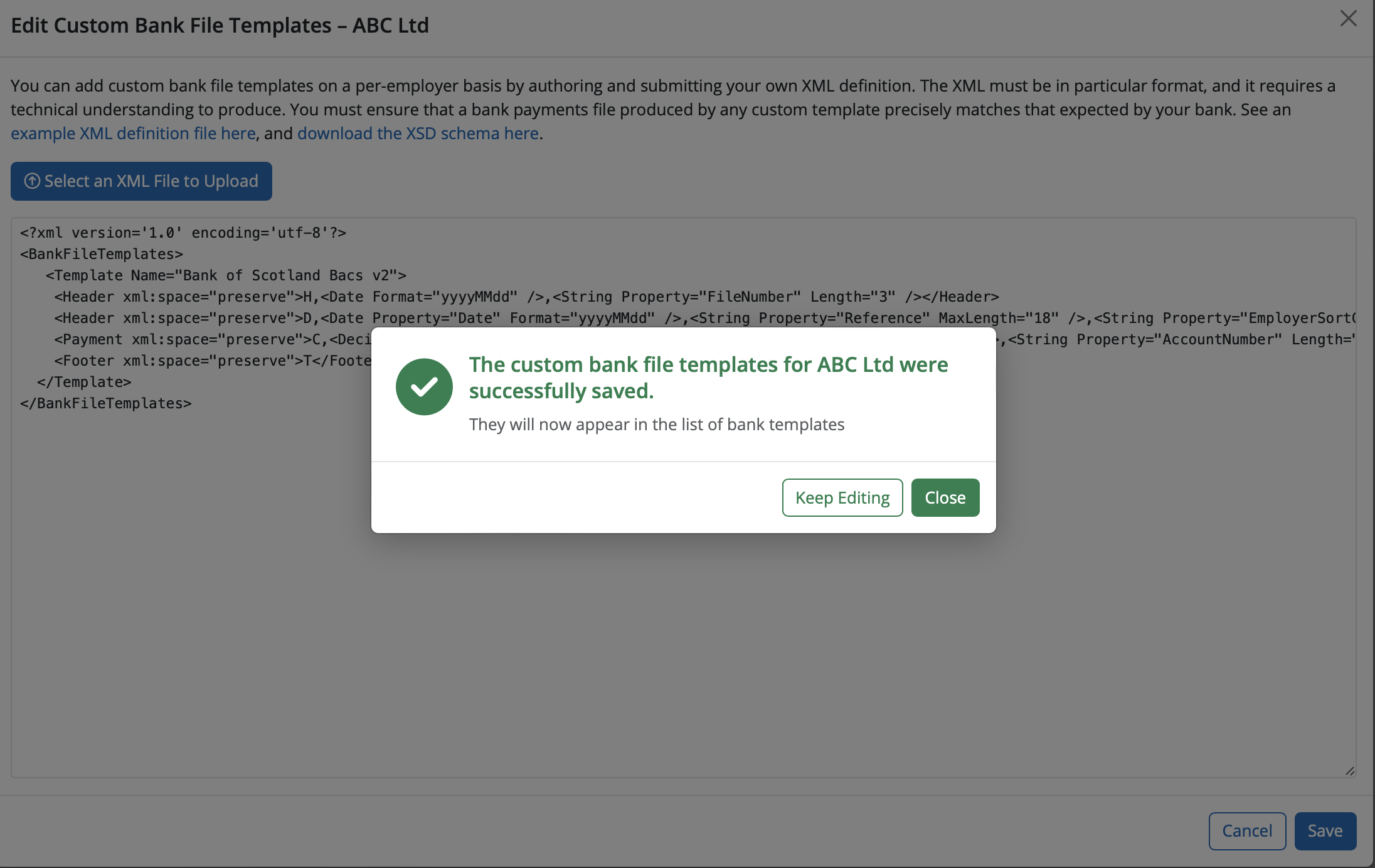 Once the file is upload select 'Save' to add the custom bank file template to the employer. A message will display to say the custom file template for the employer was saved successfully.