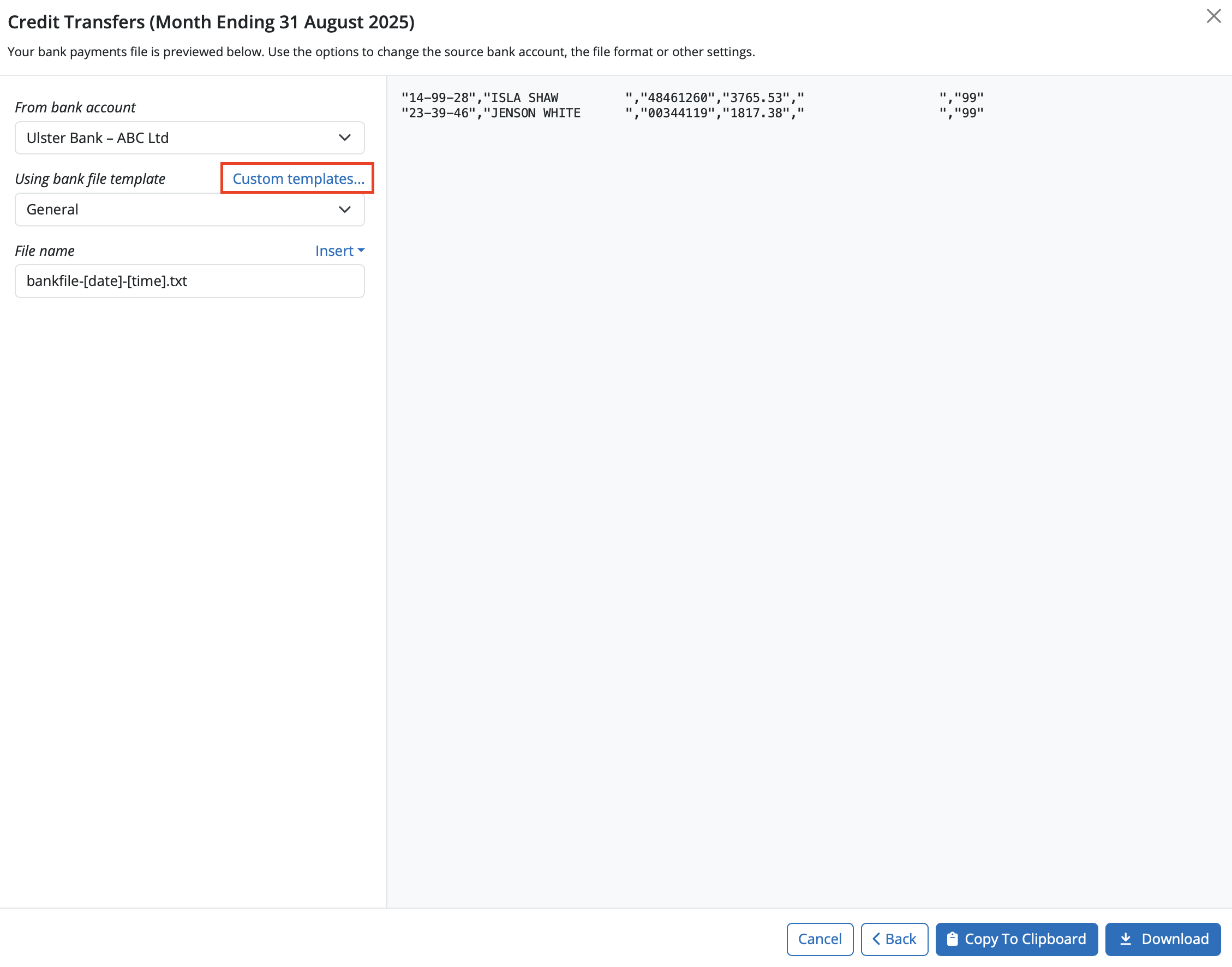 In order to upload your own custom bank file template to the employer in BrightPay please select 'Custom templates'