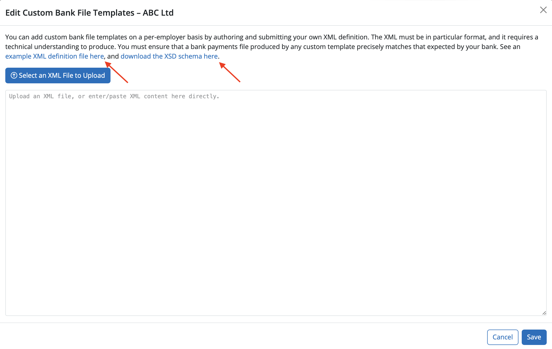 If your bank file template does not exist on the list of bank payment file options, BrightPay facilitates the option for customers to upload a custom bank file template in an employer.