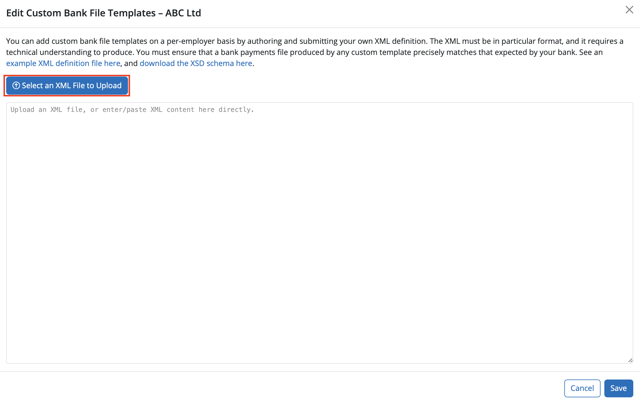 5) In order to upload the custom bank payment file to BrightPay please select 'Select an XML File to Upload'. Browse to the location of where the file is saved to and select the file and select 'Open'. (the file extension will be in the format .xml)