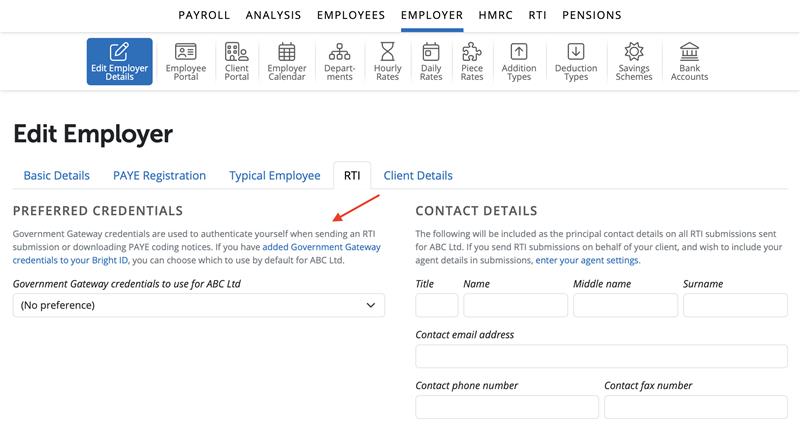 Under > Employer > Edit Employer Details > RTI tab a user can enter or select their preferred Government Gateway credentials to use for an individual employer.