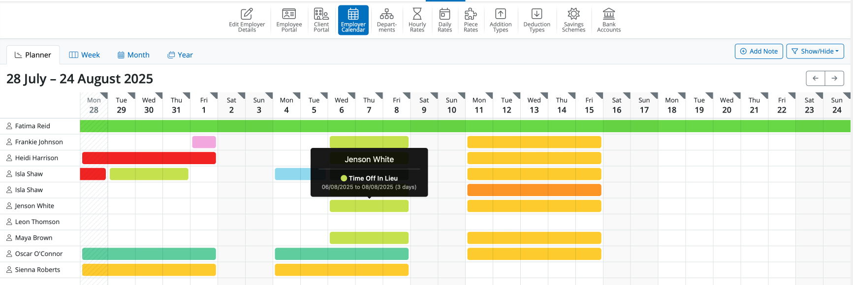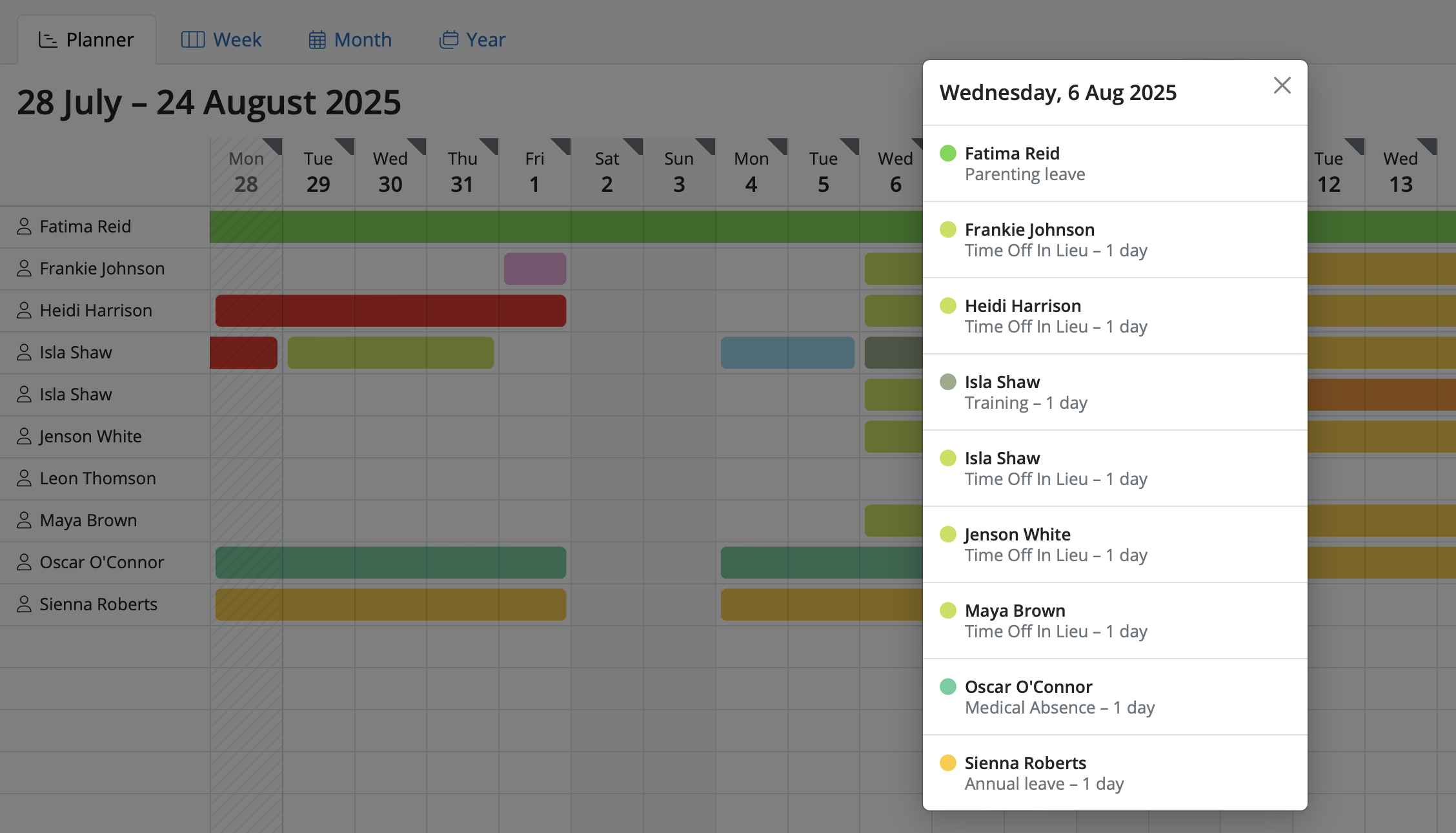 Leave is show in colour-coded bars. By hovering over a bar on the Planner view for an employee a summary view of that leave is shown.