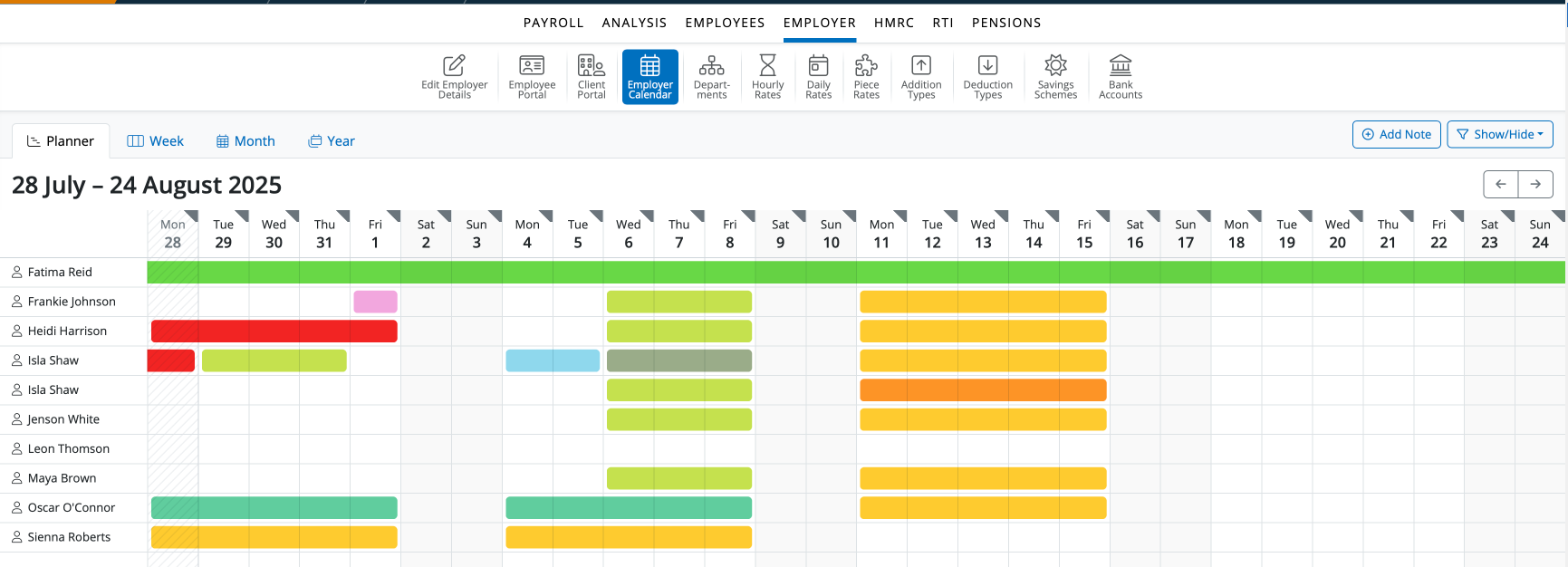 An employer-wide calendar is available in the Employer utility within BrightPay, which amalgamates all employee events along with other key payroll dates into a single view.