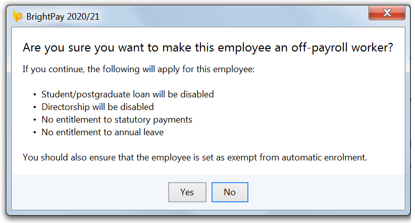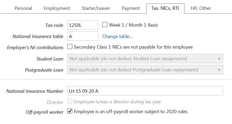 Once an employee is set up in BrightPay as an off-payroll worker, some settings will be automatically disabled, including student loans, postgraduate loans, directorship, and annual leave entitlements.