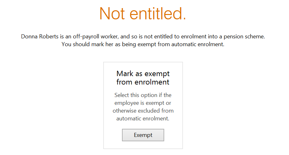For automatic enrolment, an alert will appear for off-payroll workers where the user can mark them as being exempt from auto enrolment. This will disable any automatic enrolment features that may appear for the off-payroll worker.