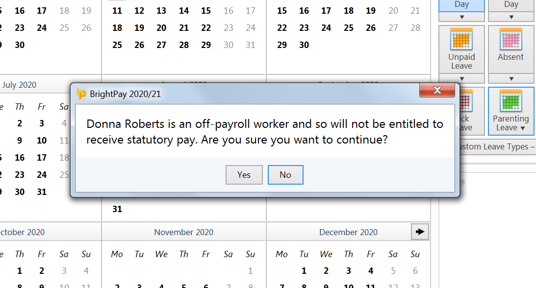 If a user adds statutory leave, a notification will highlight that the worker is not entitled to statutory pay, and the payment will not flow through to the payroll. However, the calendar can still be used if the user wishes to track this information internally.