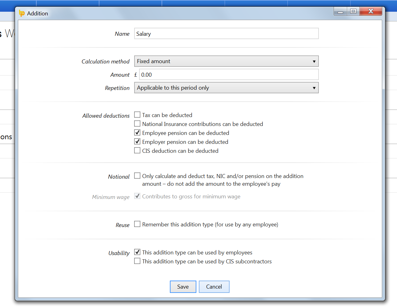 To achieve this, add a new addition type, give it a name (e.g. Salary) and untick the boxes ‘Tax can be deducted’ and ‘National Insurance contributions can be deducted’.